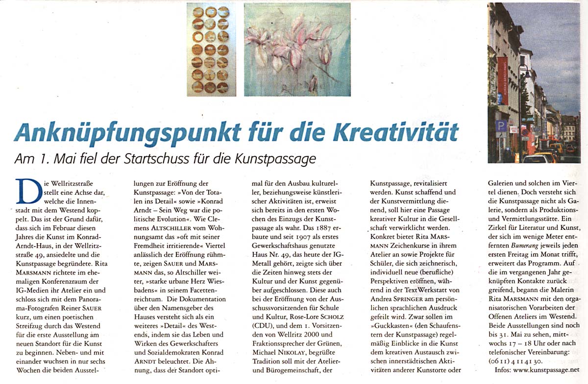 Die KunstPassage ist eine Initiative von Andrea Springer. Ich bin dort unterwegs, wo Kultur und Kunst lebendig sind: Zum Beispiel im Herzen von Wiesbaden, im Westend. Wo Kreativität ist, werden neue Ideen geboren und Kontakte geknüpft.Artikel aus der Zeitschrift "inneres Westend" zur Eröffnung der KunstPassage (jpg 300KB) |