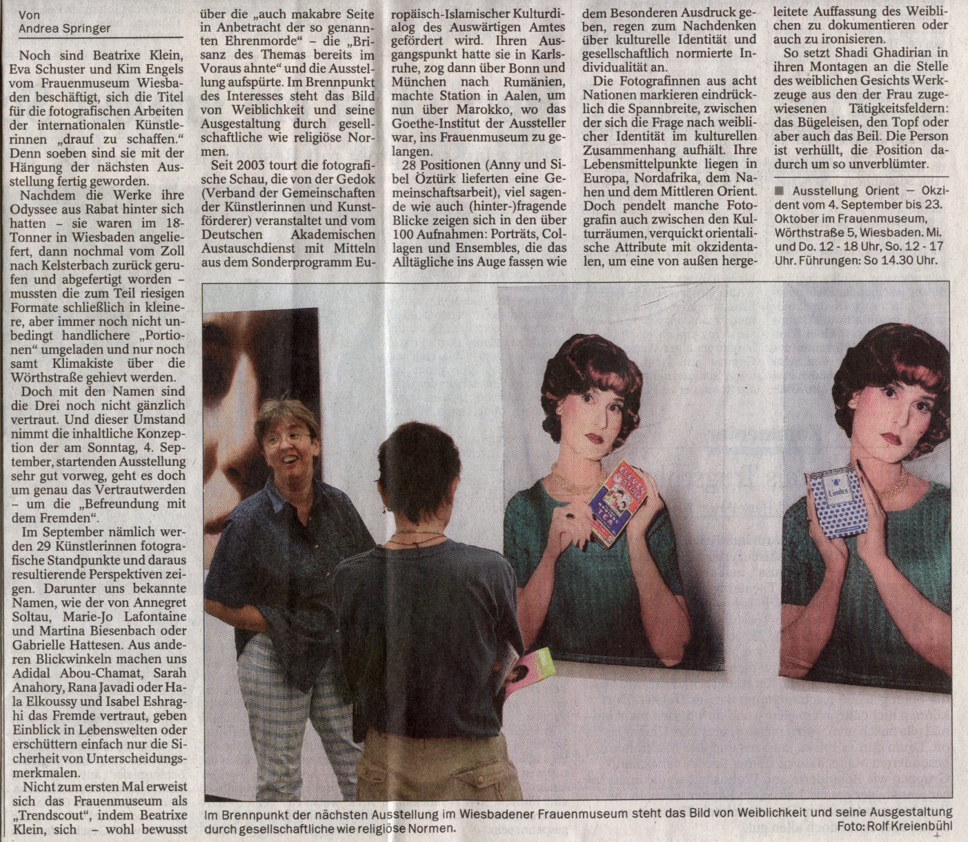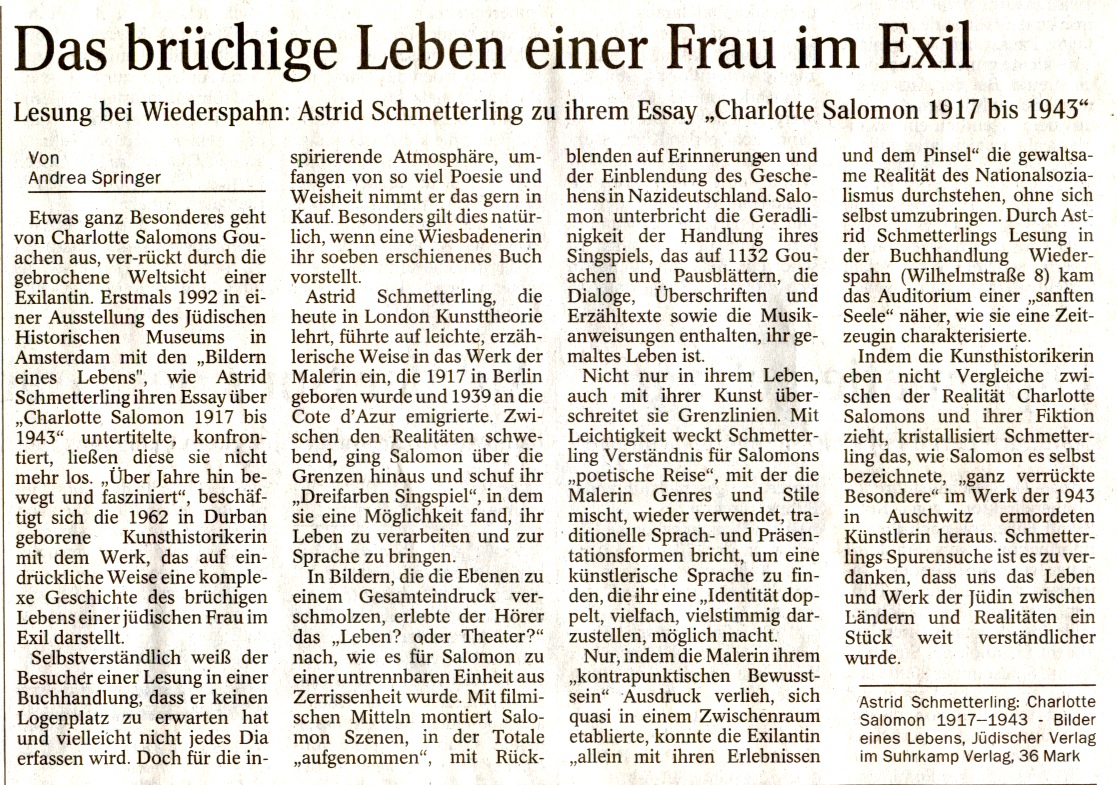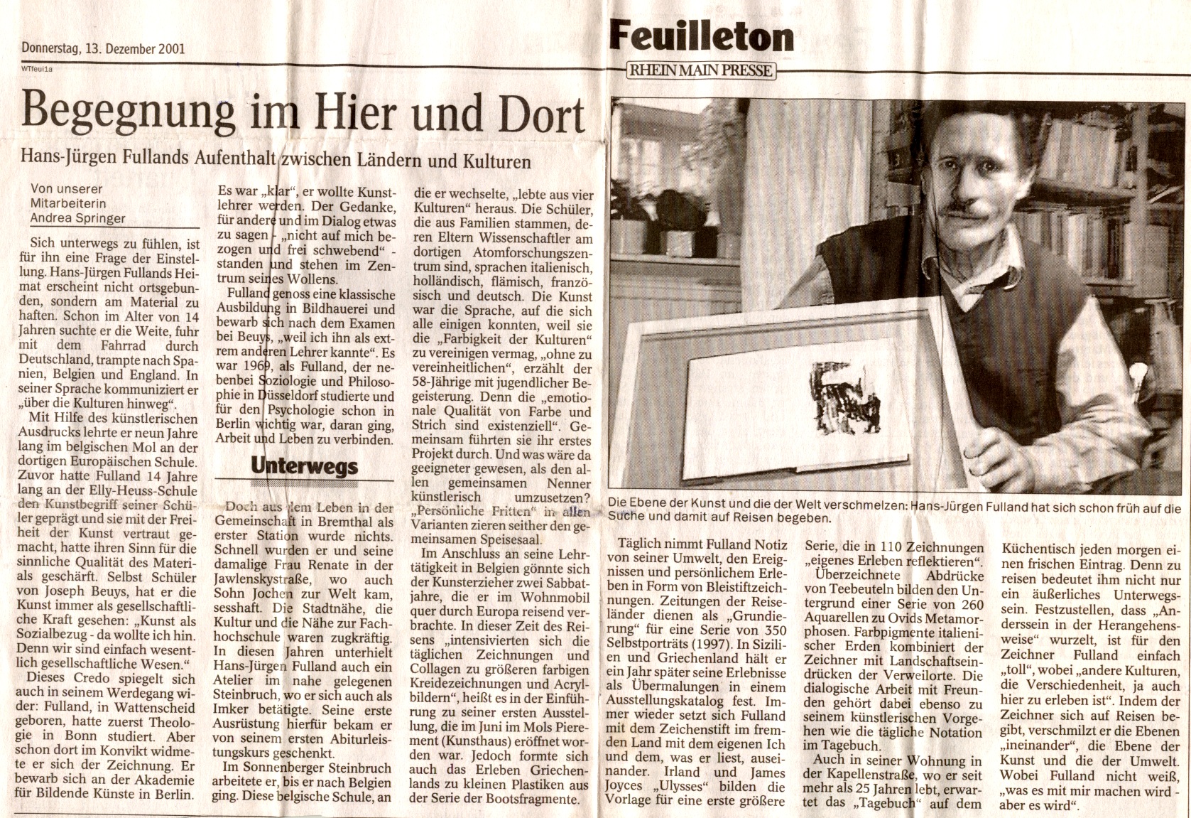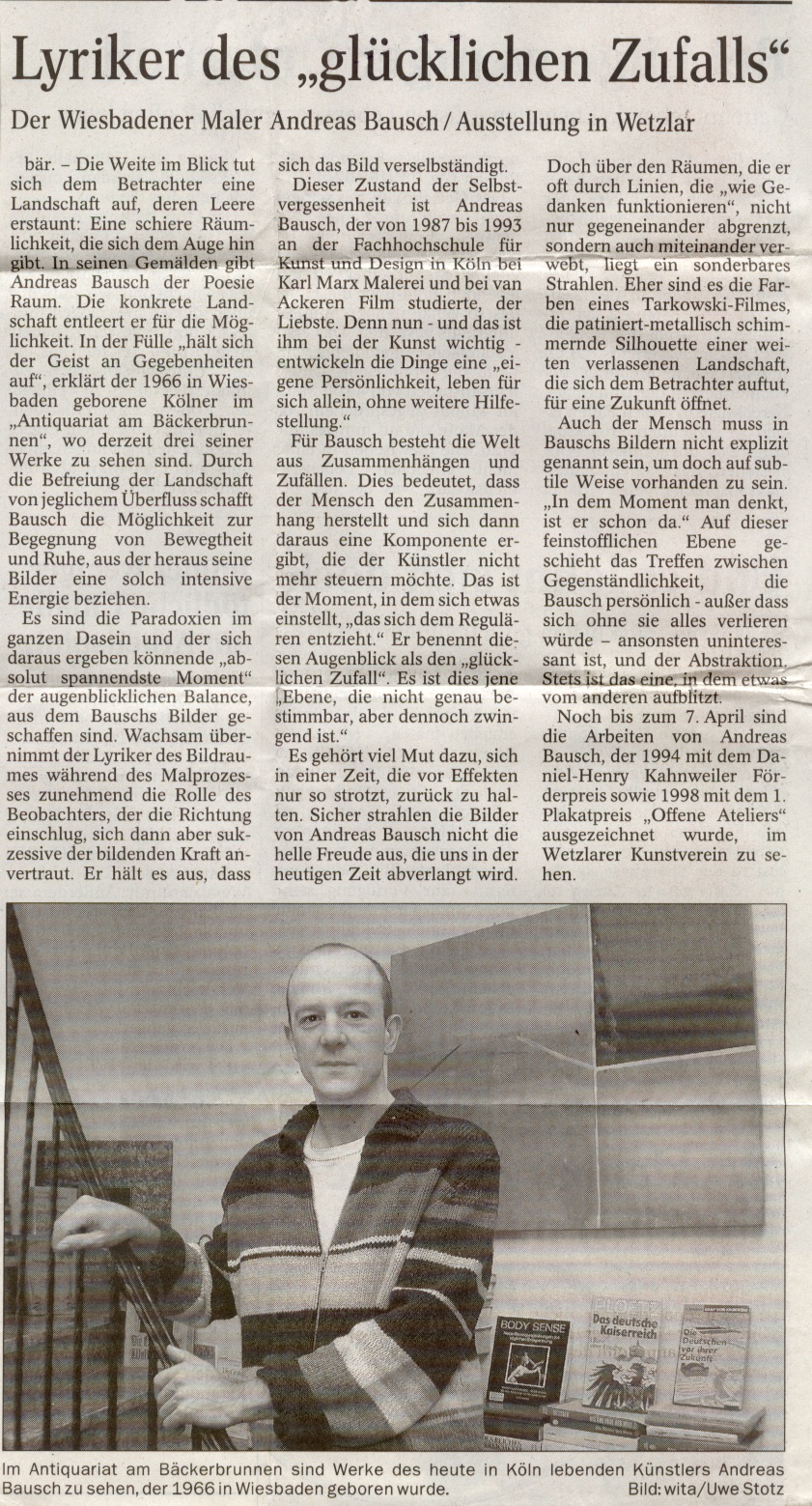 Das brüchige Leben einer Frau im Exil Lesung bei Wiederspahn jpg, 604 KB Lyriker des "glücklichen Zufalls" Der Wiesbadener Maler Andreas Bausch jpg, 704 KB Seiltänzer mit Bodenhaftung Abschied von "Kulturarbeiter" Jürgen Dusch jpg, 940 KB Frauenmuseum Wiesbaden Ausstellung "Orient - Okzident" jpg, 904 KB Begegnung im Hier und Dort Hans-Jürgen Fullands Aufenthalt zwischen Ländern und Kulturen jpg, 1.1 MB |