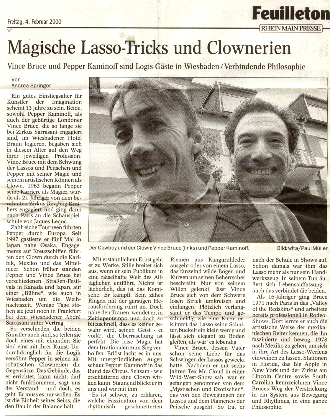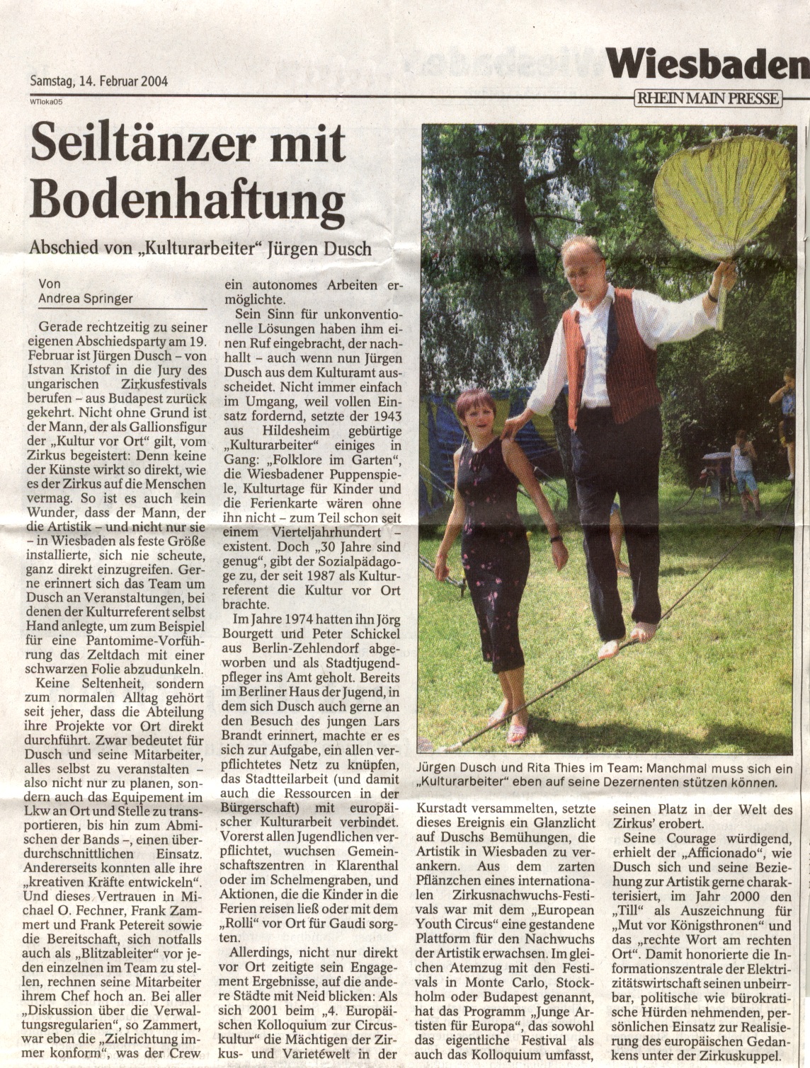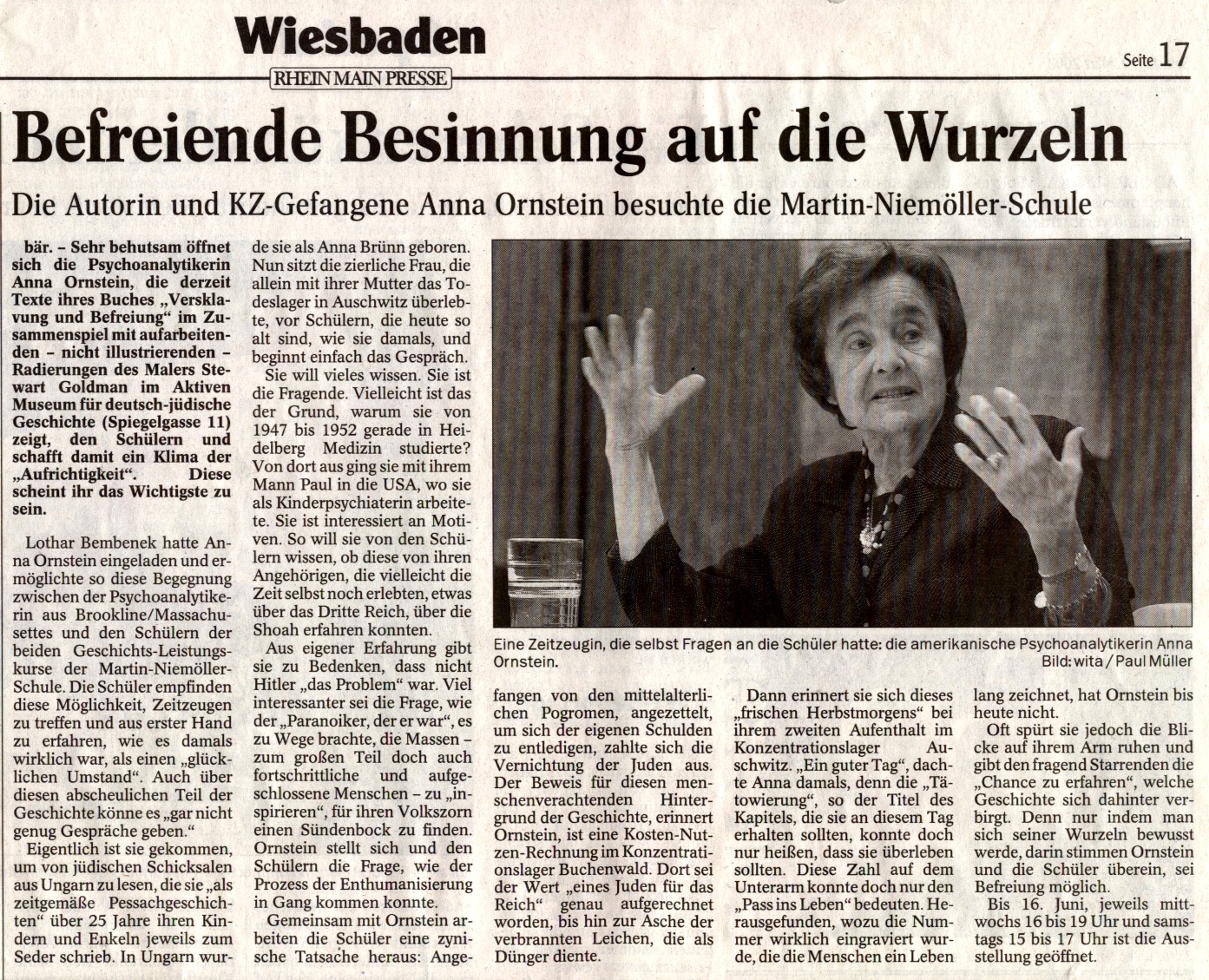 Gegen die Gleichgültigkeit Lilly Jahns Leben im Briefwechsel "Mein verwundetes Herz" jpg, 456 KB Befreiende Besinnung auf die Wurzeln Die Autorin und KZ-Gefangene Anna Ornstein besucht die Martin-Niemöller-Schule jpg, 932 KB Magische Lassotricks und Clownerien Vince Bruce und Pepper Kaminoff sind Logis-Gäste in Wiesbaden jpg, 880 KB Sinnlicher Ausflug zu Kultur und Natur Inselgalerie Rettbergsaue bietet Ausstellungen von Rang und Entspannung auf der Wiese jpg, 964 KB |