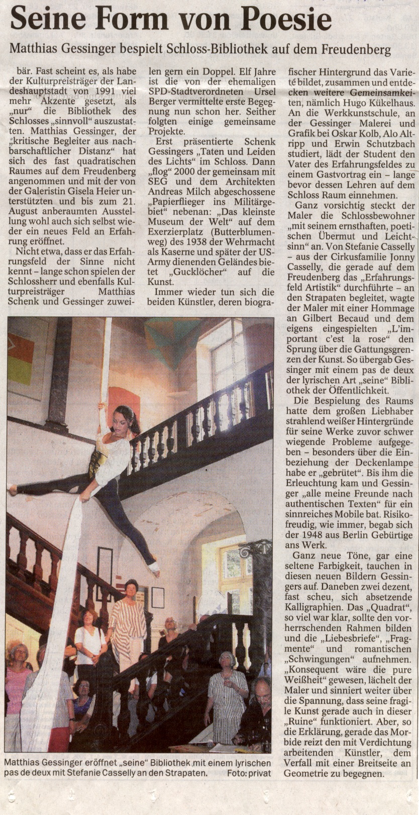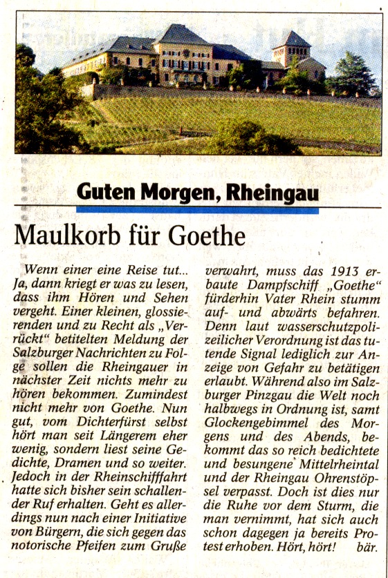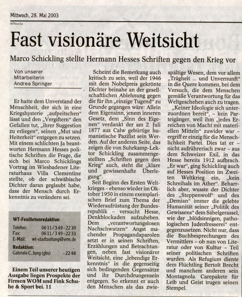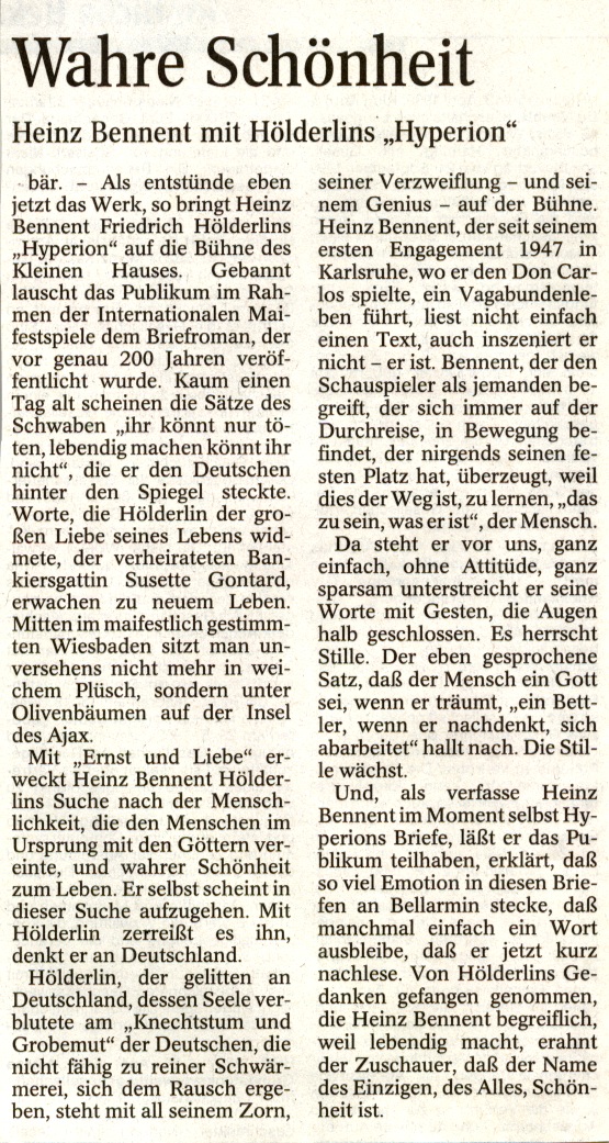 Maulkorb für Goethe Aus "Guten Morgen, Rheingau" jpg, 344 KB Eine Spur ins Bewusstsein Deutschlandpremiere von "Gebürtig" auf der Caligari FilmBühne jpg, 360 KB Seine Form von Poesie Matthias Gessinger bespielt Schloss-Bibliothek auf dem Freudenberg jpg, 760 KB Wahre Schönheit Heinz Bennent mit Hölderlins "Hyperion" jpg, 404 KB Fast visionäre Weitsicht Herrmann Hesses Schriften gegen den Krieg jpg, 564 KB |